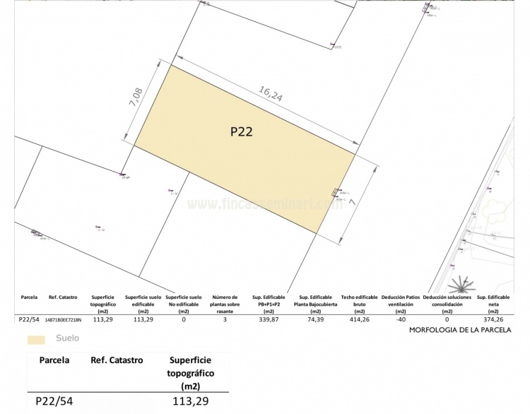 Superficie edificable de 339,87 m2 distribuidos en planta baja + 2 plantas y ático.
