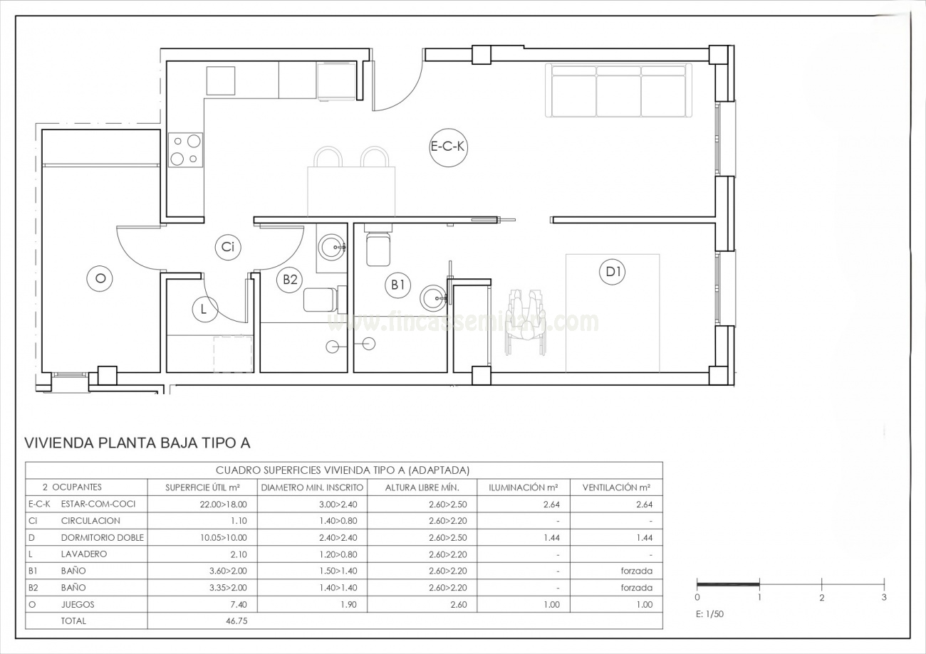 Piso en planta baja con una superficie de 56,40 m2, distribuidos en salón comedor con balcón, dos baños adaptados, cocina, lavadero, amplio dormitorio con baño en suite, un espacioso dormitorio adaptado y despacho.