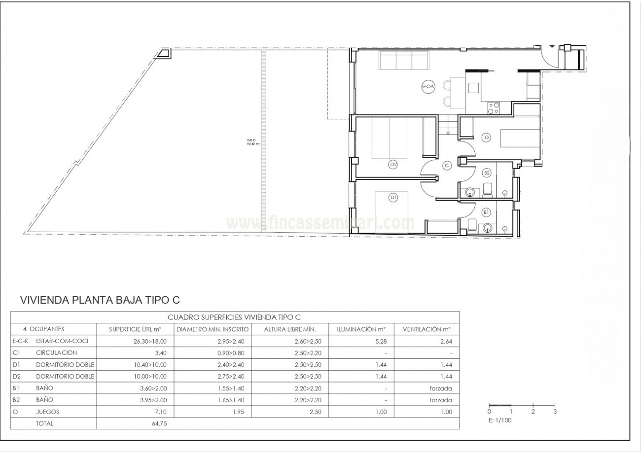 Dispone de una superficie construida de 74,80 m2 distribuidos en 2 dormitorios dobles, 1 dormitorio individual o despacho, lavadero, salón comedor y cocina integrada con gran ventanal con acceso directo al magnífico patio de la casa.