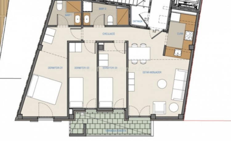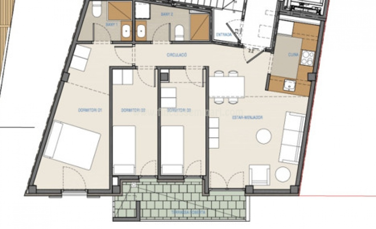 Ésta dispone de tres habitaciones, dos baños completos, salón comedor con acceso a una terraza-balcón y cocina.